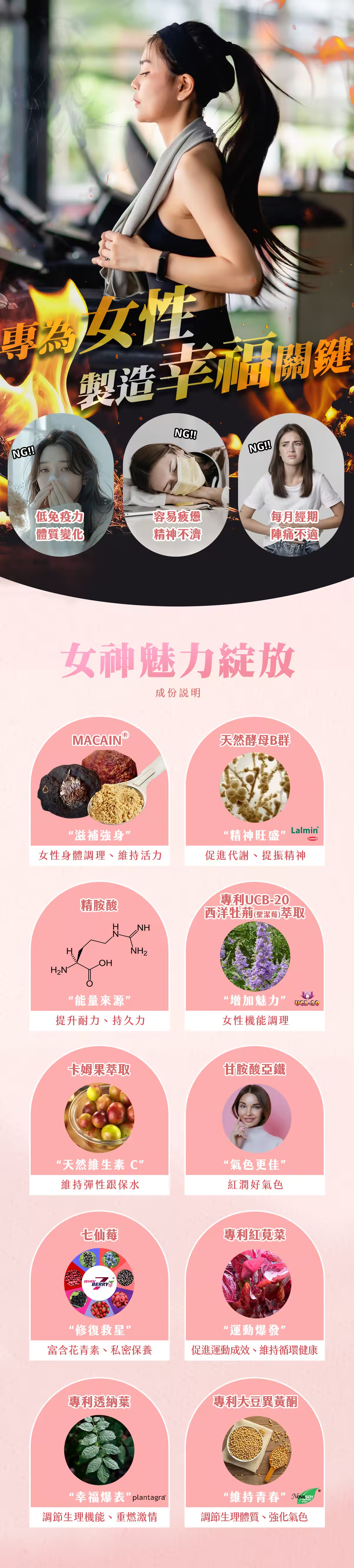 #想變漂亮 七仙莓、卡姆果、甘胺酸錏鐵拳 #婦科調理 大豆異黃酮、瑪卡 #熟齡婦女的身心保健 天然酵母B群、專利UCB-20西洋牡荊(聖潔莓)萃取 #晚上功課加強 專利透納葉