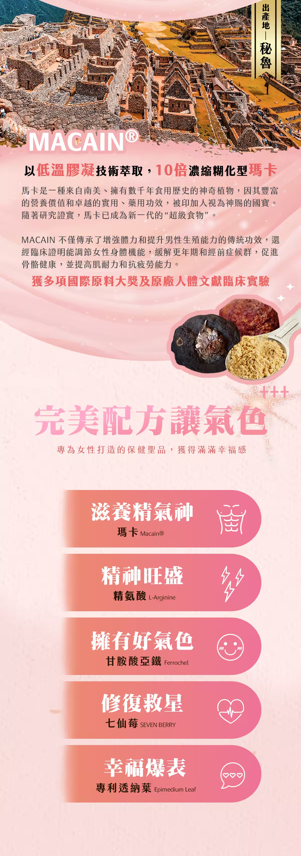 專業瑪卡品牌MWJ主理人小花,綜合個人與身邊姊妹的困擾,親研出專為女性打造的瑪卡保健品,能調節女性身體機能,讓妳在每個月的特殊時刻依然充滿魅力與活力。 新一代的「超級食物」被視為秘魯國寶的瑪卡,已有數千年食用歷史。 MACAIN®臨床證明能調節女性身體機能,緩解更年期和經前症候群,維持骨骼健康,並提高運動能力和抗疲勞能力。 與在保健品業擁有14年專業的營養師合作,比起多元功效更著重 #有效 與 #有感,